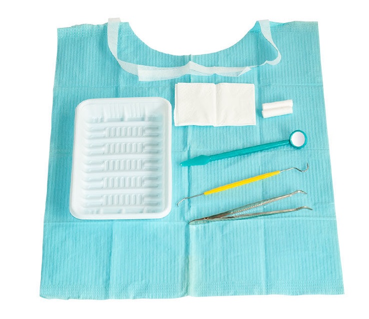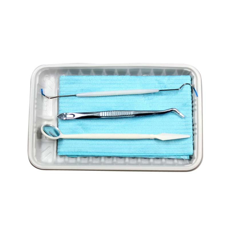 Glass mirror, double-headed probe, Galvanized tweezers, dental bibs, PP tray, 2#cotton roll and tissue